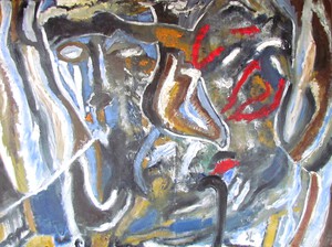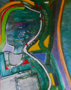 Ineens verscheen voor mij een schimmige figuur te midden van een organisch, golvend landschap van kleur en vorm. Balancerend tussen abstractie en figuratie, waarbij iemand op gaat in zijn omgeving tussen het licht en schaduw, de beweging en stilte.
